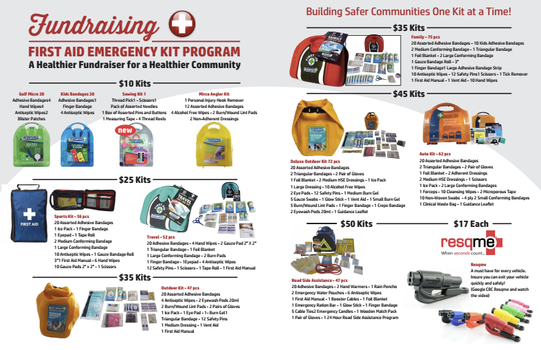 Health Canada Approved First Aid Kits – This is a great fundraiser for Christmas or in March/April to get ready for Emergency Preparedness Week and spring/summer activities. Any time of year is a good time to promote safety and run our fundraiser!